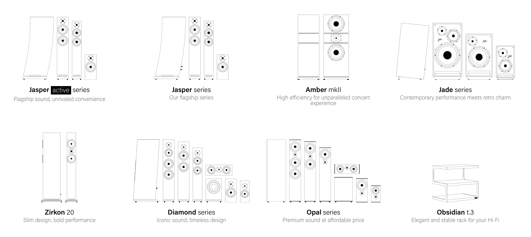 Models: Jasper 25 mkII, Jasper 23, Jasper Monitor 18 (plus Jasper Active variants with WiSA). Pylon Audio+5Pylon Audio+5Pylon Audio+5